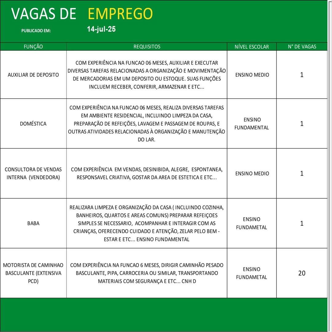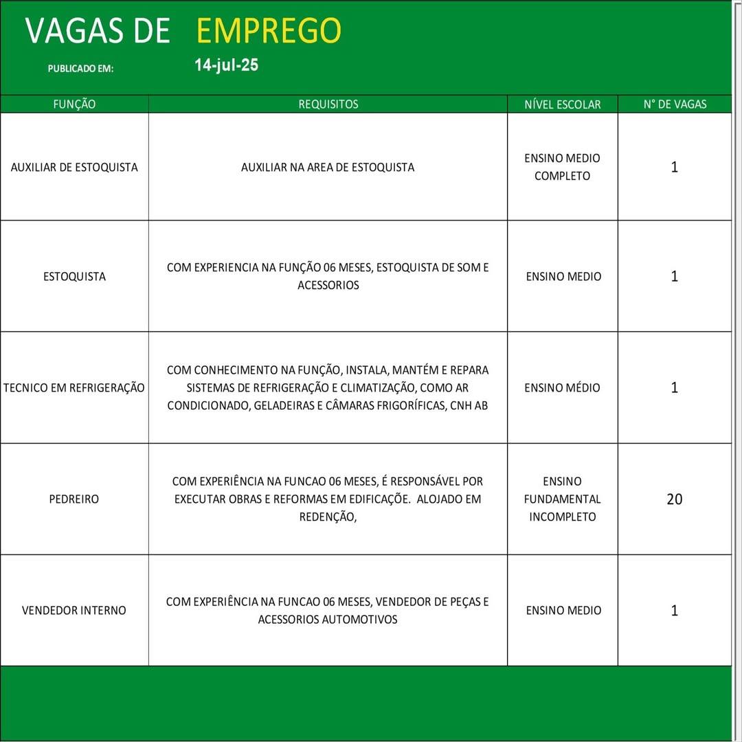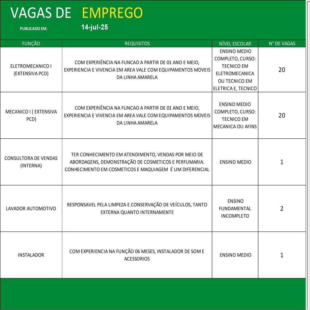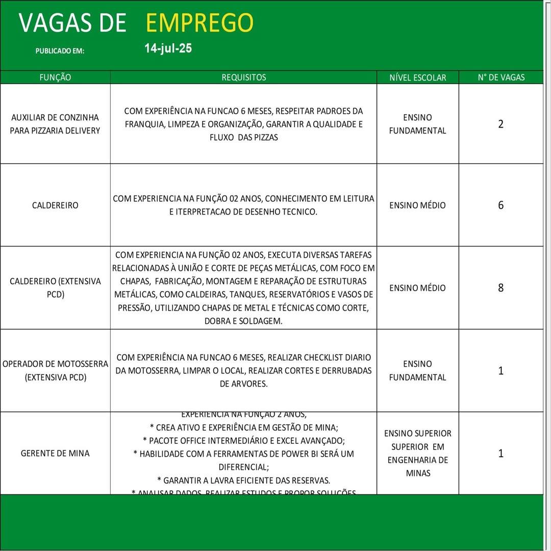 O Sine de Parauapebas divulgou as vagas em aberto nesta segunda-feira (14). Os interessados devem apresentar currículo, RG, CPF, Carteira de Trabalho e comprovante de residência.
