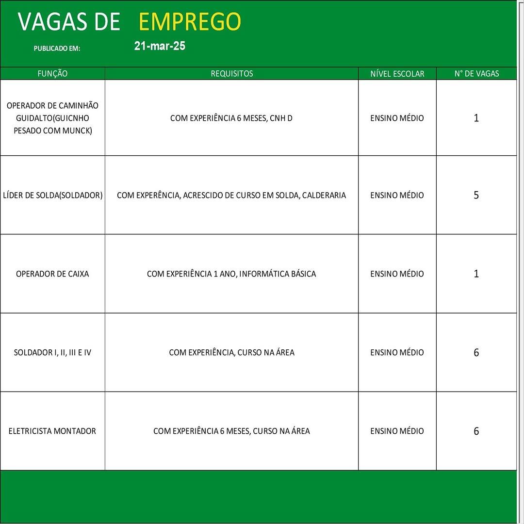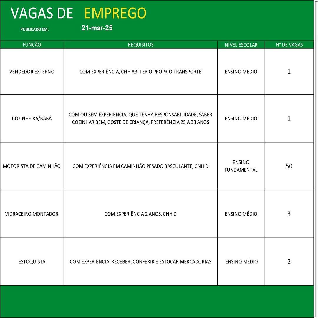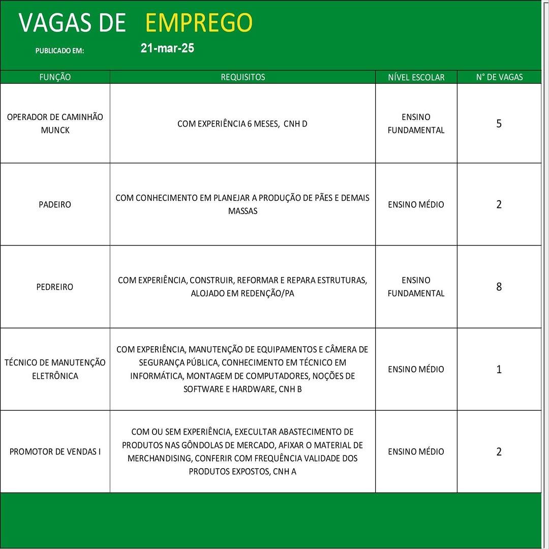 O Sine de Parauapebas divulgou as vagas em aberto nesta sexta-feira (21). Os interessados devem apresentar currículo, RG, CPF, Carteira de Trabalho e comprovante de residência.