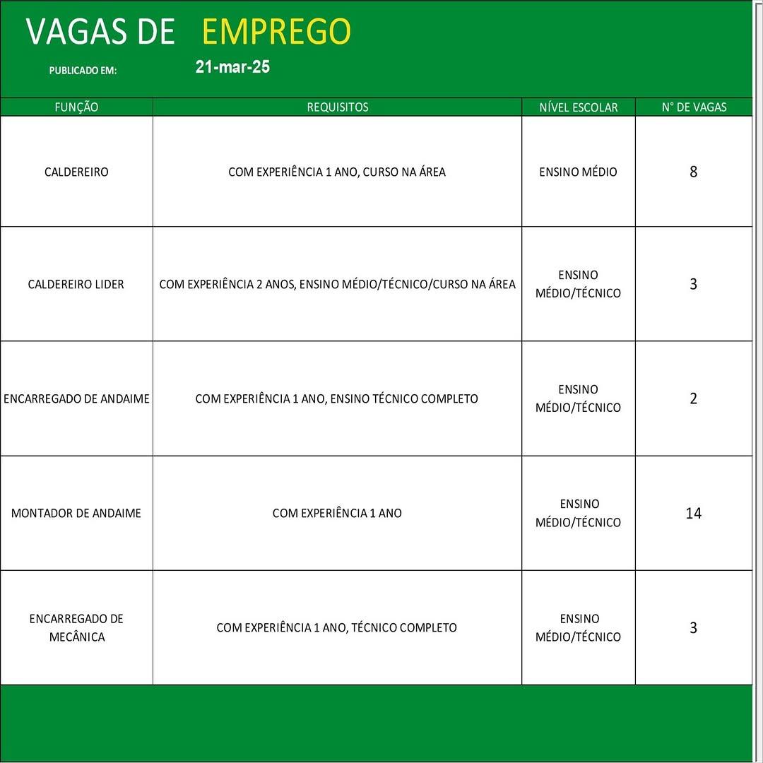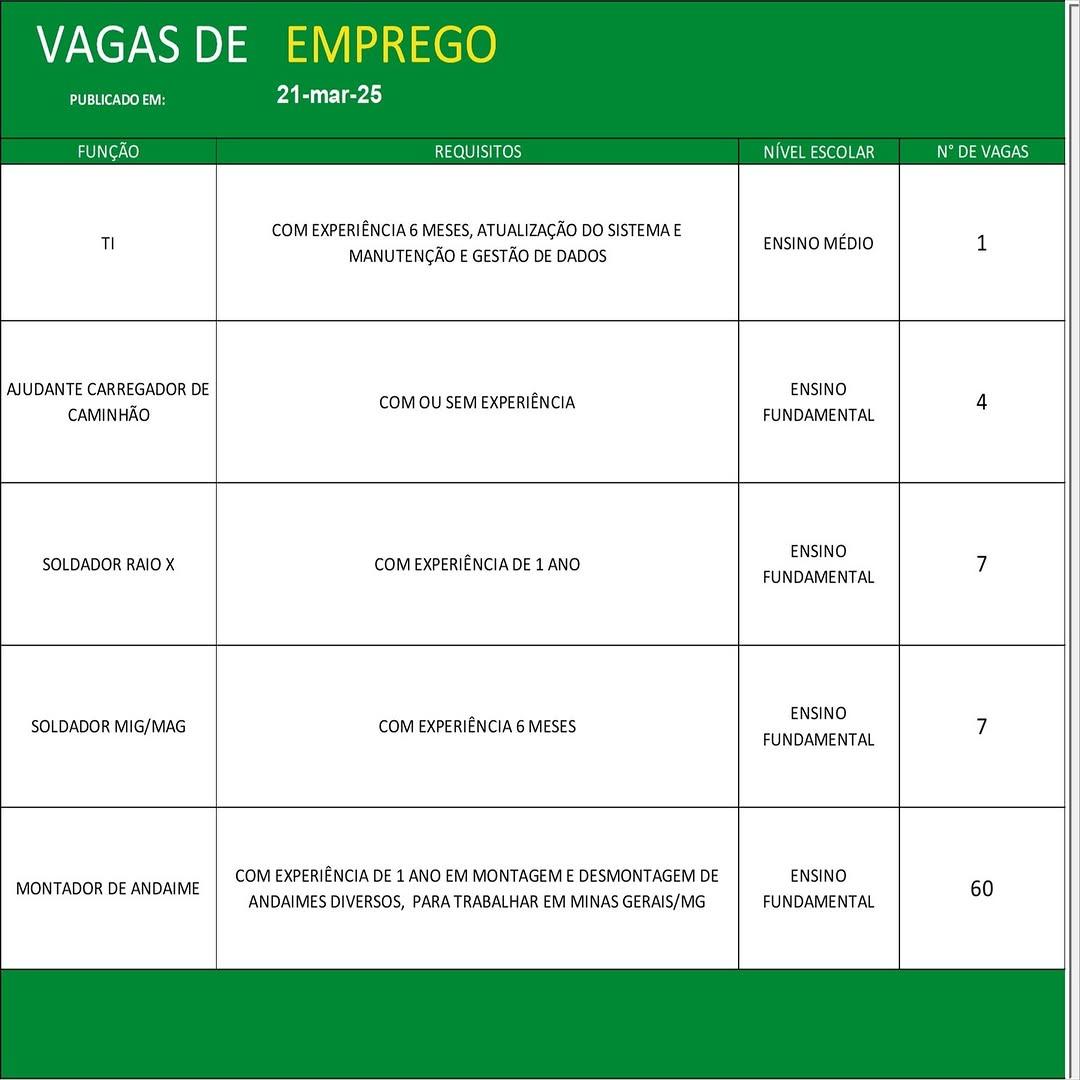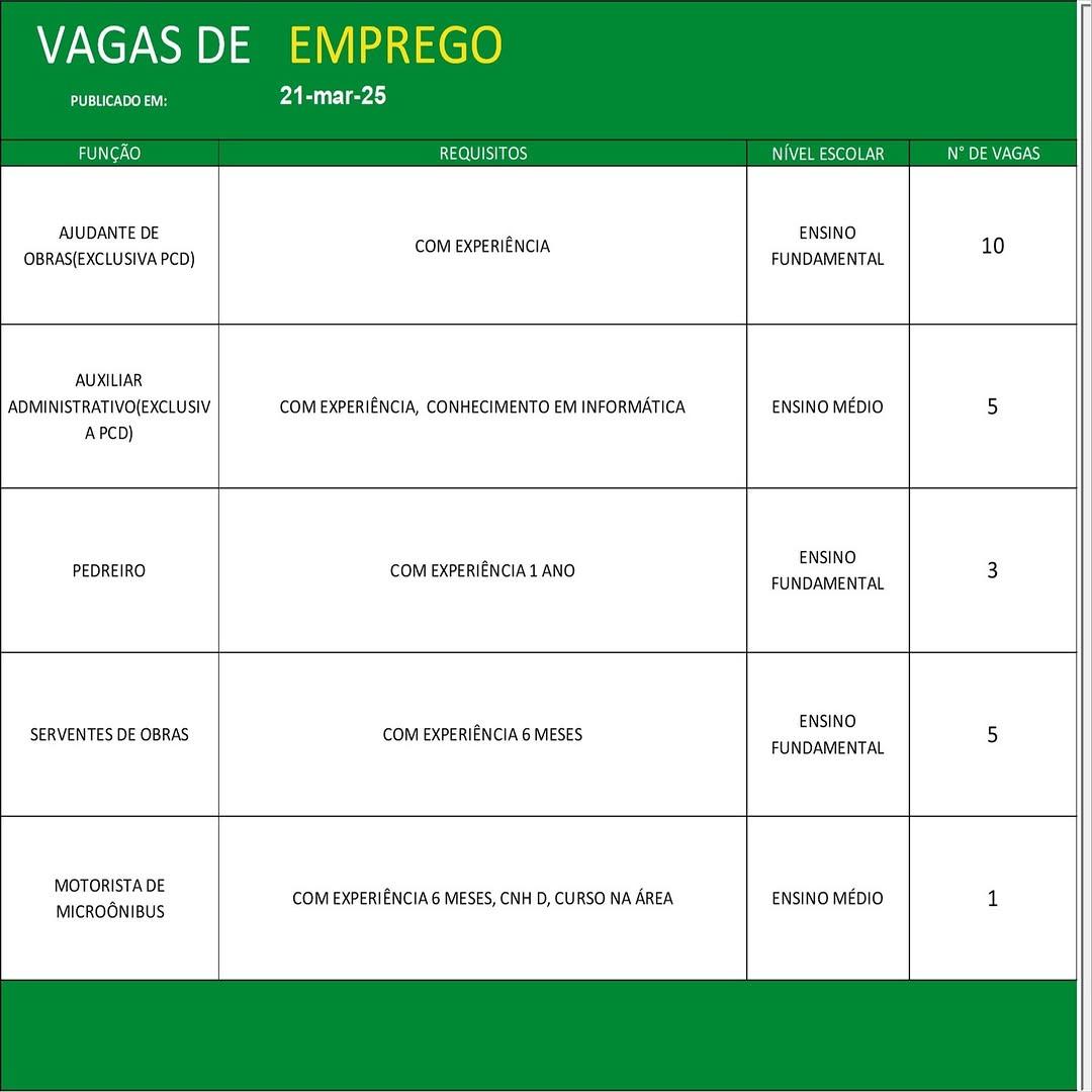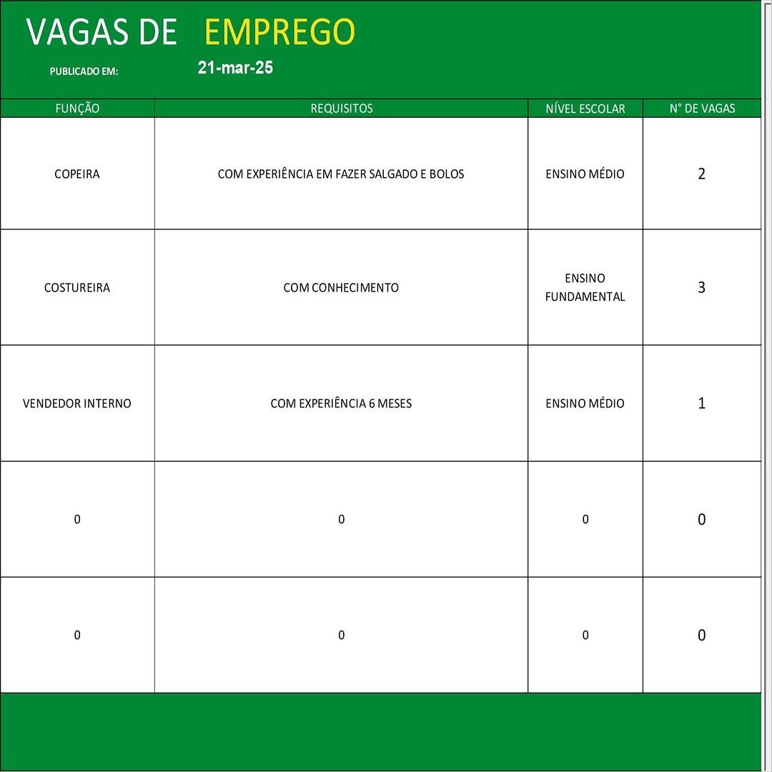 O Sine de Parauapebas divulgou as vagas em aberto nesta sexta-feira (21). Os interessados devem apresentar currículo, RG, CPF, Carteira de Trabalho e comprovante de residência.