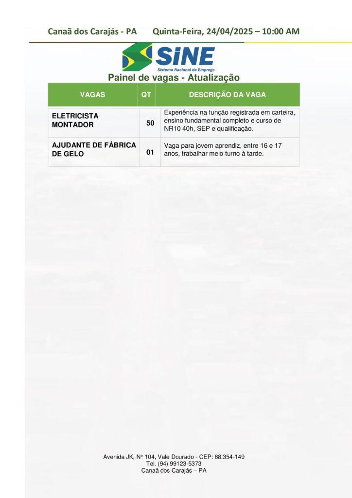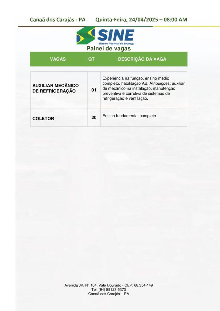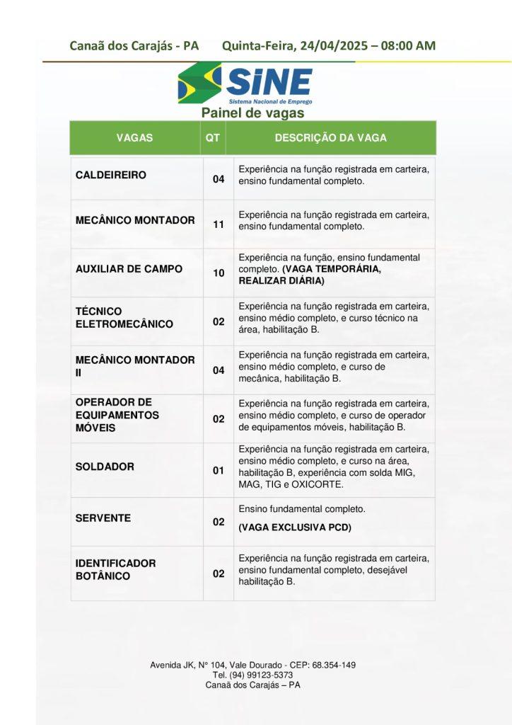 O Sine de Canaã dos Carajás divulgou as vagas em aberto nesta quinta-feira (24). Os interessados devem apresentar currículo, RG, CPF, Carteira de Trabalho e comprovante de residência. Para mais informações, ligue (94) 99123-5373.