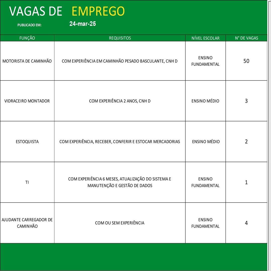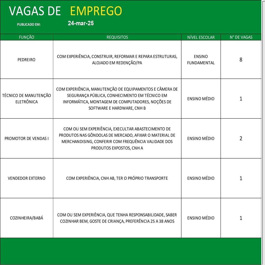 O Sine de Parauapebas divulgou as vagas em aberto nesta segunda-feira (24). Os interessados devem apresentar currículo, RG, CPF, Carteira de Trabalho e comprovante de residência.