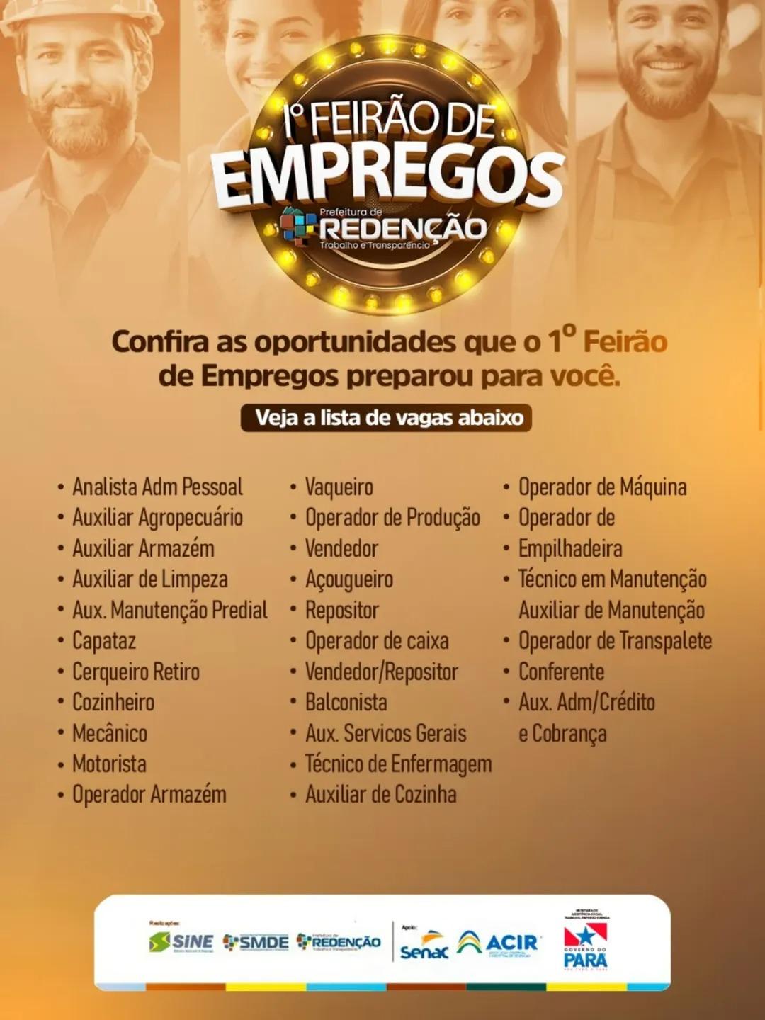 Na quinta-feira, 6 de novembro, será realizado o 1º Feirão de Empregos de Redenção, iniciativa única na cidade que vai reunir pessoas em busca de novas oportunidades de trabalho e empresas interessadas em contratar profissionais.