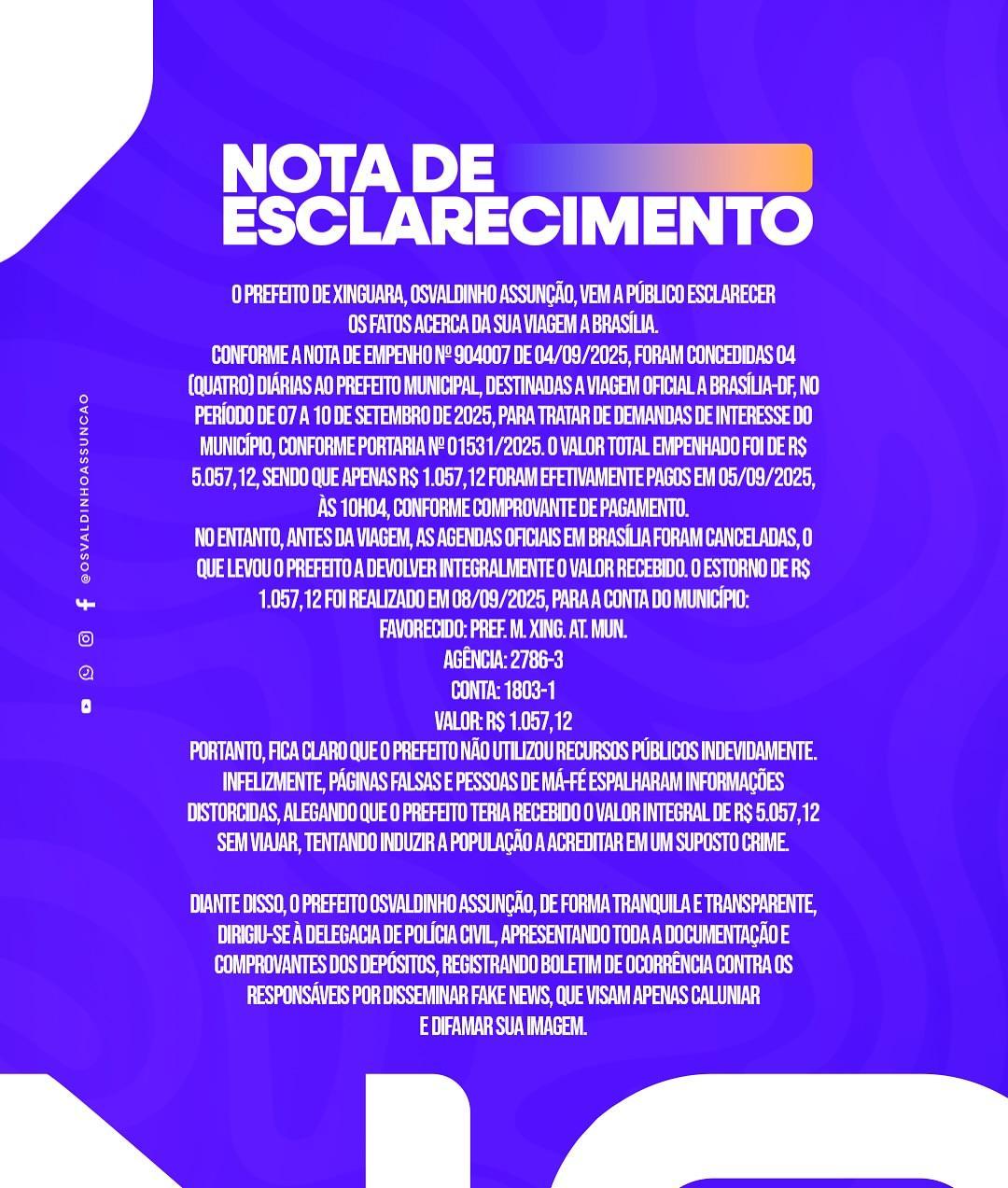 O prefeito de Xinguara, Osvaldinho Assunção, veio a público nesta terça-feira (16) esclarecer informações falsas veiculadas nas redes sociais a respeito de sua viagem oficial a Brasília, originalmente programada para o início de setembro.